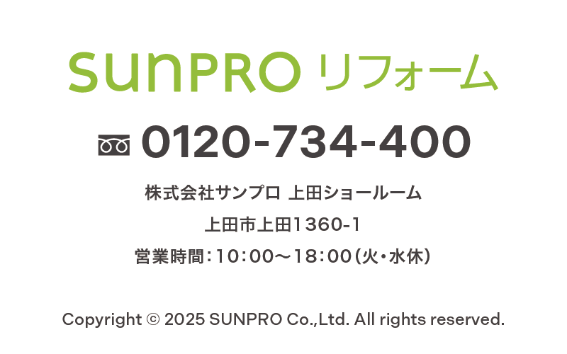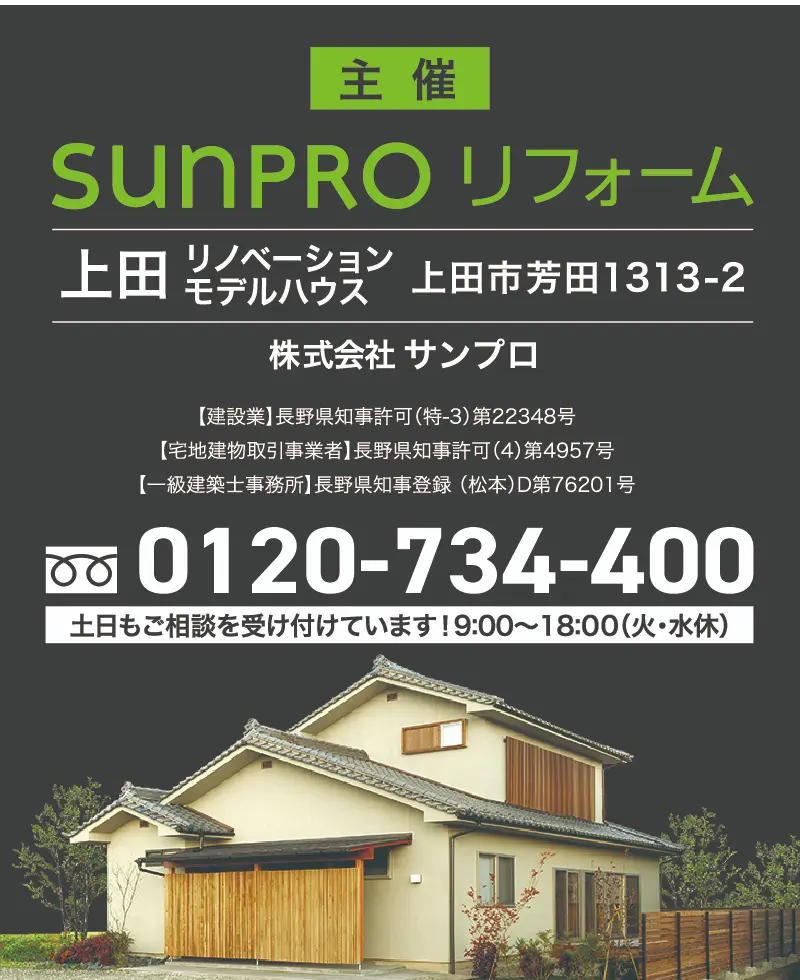 必須 ご来場希望日時 --- 必須 ご検討内容 住まいの総合的なリフォーム・リノベについてキッチン・トイレ・お風呂などの水廻りのリフォーム断熱や耐震などの住宅性能について内装・インテリアを変えたい土地探し・中古住宅探し売却・住み替えの相談住宅ローン・資金について少し先の家づくりのために情報収集したいその他 必須 お名前 必須 ふりがな 必須 郵便番号 必須 ご住所 必須 メールアドレス 必須 電話番号 差支えなければ、以下の質問にもお答えください。 任意 工事完了希望時期について 時期検討中・これから検討すぐにでも1ケ月以内1ケ月~半年以内半年~1年以内1年~2年以内2年~3年以内3年以上先 任意 このイベントを知ったきっかけ InstagramfacebookホームページGoogle検索バナー広告週刊さくだいら紹介その他 任意 ご質問・ご要望等 [ドメイン指定受信のお願い] sunpro36.co.jp のドメイン指定受信の設定をお願いいたします。 お申込みして頂いたお客様には、自動で受付確認メールを送信しております。受付確認メールを受信されていないお客様は、受信設定により弊社からのメールを受信拒否している恐れがございますので、ご確認下さい。特にキャリアメールは、キャリアによって複数の受信設定がございますので、事前にご確認お願いいたします。 このまま進むことで、当社の個人情報取扱方針にご同意いただいたものとしてお手続きを承ります。 内容をご確認のうえ、よろしければボタンを押してお進みください。 ありがとうございます。メッセージは送信されました。 15分以内に確認用の自動返信メールが届きます。 メールが届かない場合は、メールアドレスが誤っているか、確認メールが迷惑メールフォルダ等に振り分けられている、ドメイン指定で拒否されている可能性がありますので、再度ご確認をお願いいたします。 また、ご使用の端末/メールシステムの空き容量不足により、メールを受信できない場合もございます。その際は空き容量の確保をお願いいたします。 よろしくお願いいたします。 閉じる